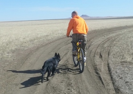 | riding bicycle with dog turquoise german shepherd dog dogs bike trail mountain |